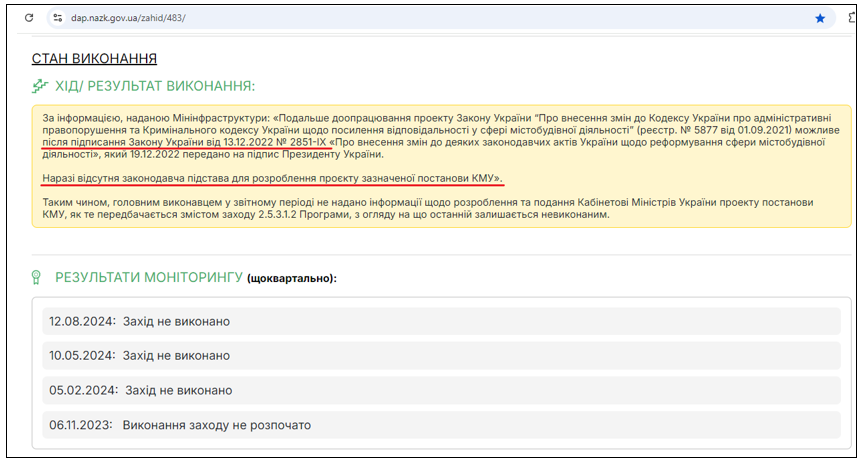 Мінінфраструктури зазначеного заходу також не виконало, а на своє виправдання повідомило, що це можливо лише після підписання скандальної містобудівної “реформи 5655” (Закон “Про внесення змін до деяких законодавчих актів України щодо реформування сфери містобудівної діяльності”).