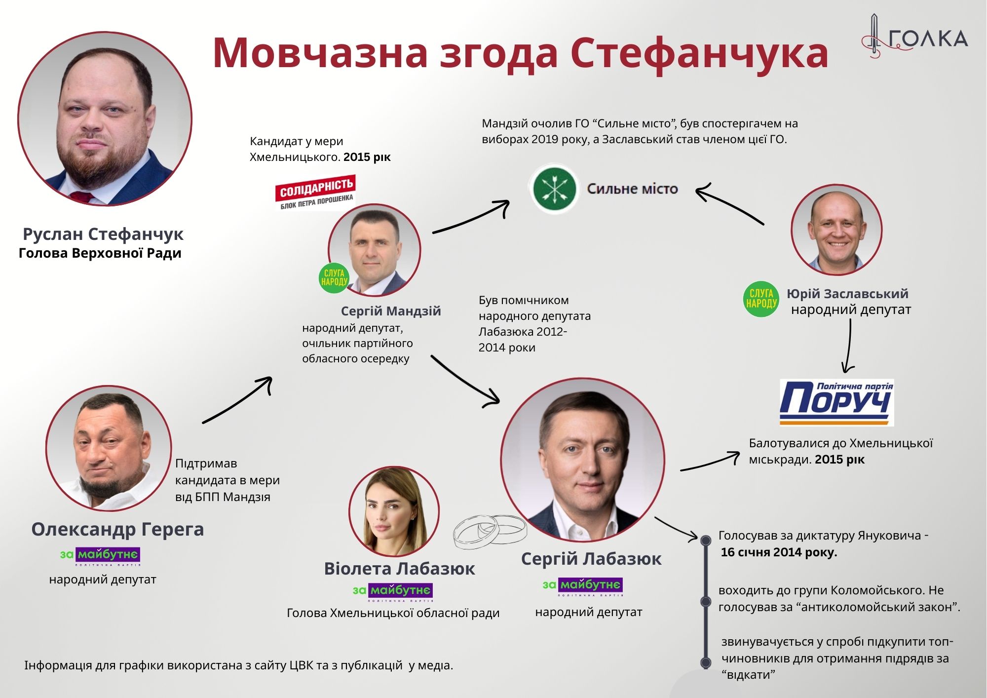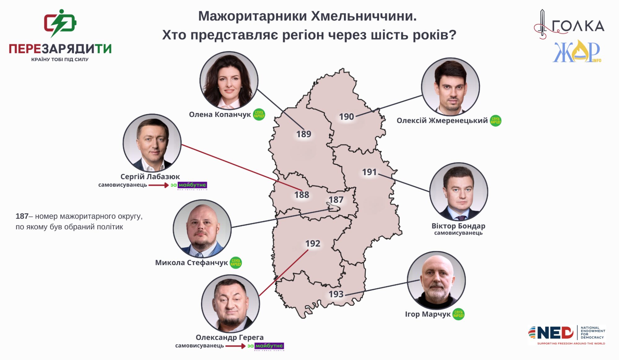 Ще три округи дісталися одному позафракційному депутату Віктору Бондару і ще двом політикам, які увійшли до депутатської групи “За майбутнє” – Сергію Лабазюку та Олександру Герезі. Водночас на Хмельниччині, як і в інших регіонах, приналежність до різних партій може бути номінальна, а свої депутати можуть бути в різних списках чи фракціях. “Слуги народу” мають зв’язки з депутатською групою “За майбутнє”. І з огляду на те, що Стефанчук мав вплив на формування списку, то люди дотичні до нардепа Лабазюка до нього цілком ймовірно, що потрапили за мовчазної згоди чинного спікера.