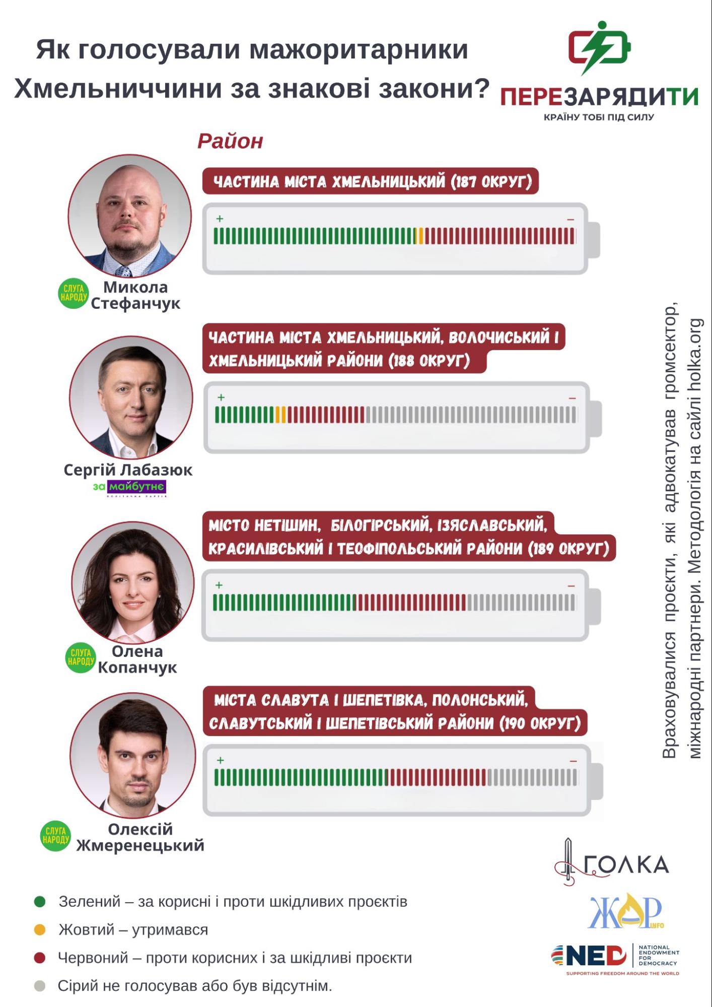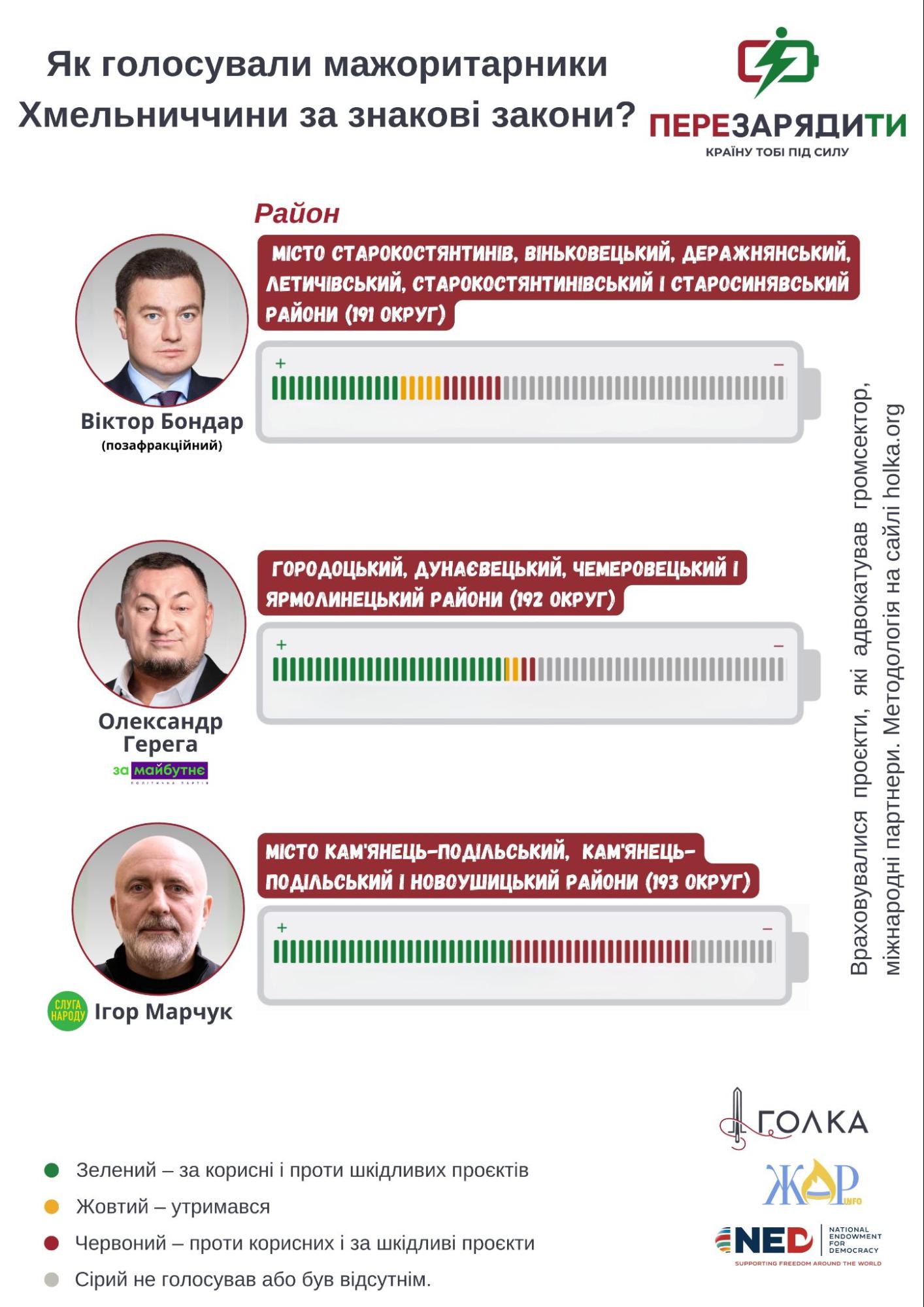 Із Хмельниччини не голосували за цей законопроєкт лише Сергій Лабазюк та Олександр Герега. Перший не голосував та був відсутнім і під час розгляду інших питань порядку денного, а другий же голосував “за” інші питання порядку денного. Останнє свідчить про небажання брати відповідальність конкретно за підтримку цього законопроєкту.