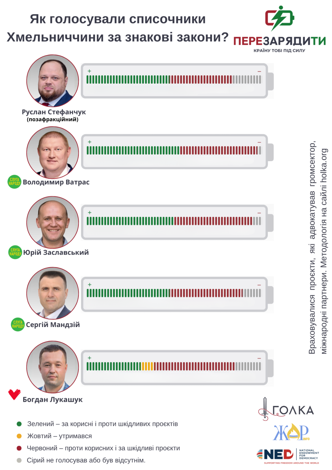 Громадська ініціатива “Голка” разом з коаліцією інших громадських організацій, зокрема з Центром розвитку інновацій та Українською природоохоронною групою, запустила волонтерський проєкт “Перезарядити країну”. Аналітики склали перелік корисних та шкідливих для розвитку країни законодавчих ініціатив, голосування за які є маркерами для кожного з депутатів. Всі ці голосування наповнюють батарейку голосувань кожного парламентаря і показують, який заряд він дає країні. Окрім голосувань, які вже відбулися, інструмент містить єдине вікно для адвокації громадського сектору, куди будуть вноситися корисні та шкідливі закони, які перебувають на розгляді парламенту. Цей проєкт створений за кошти великого українського народу і з листопада 2025 року підтримується NED.