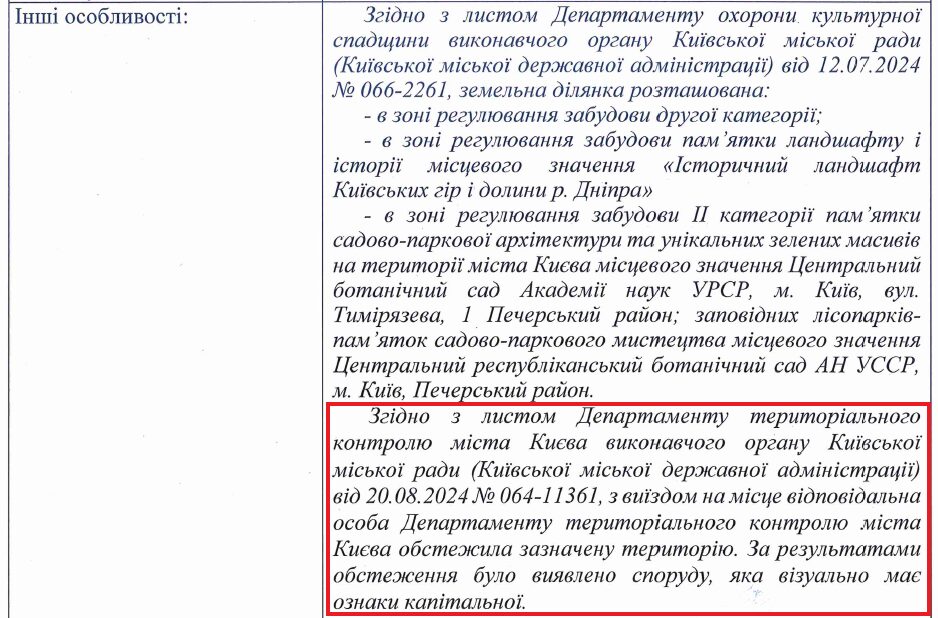 Наприклад, у випадку на вул. Катерини Білокур ділянку оглядав представник Департаменту територіального контролю КМДА. В пояснювальній записці зазначено, що він виявив “споруду, яка має ознаки капітальної“.