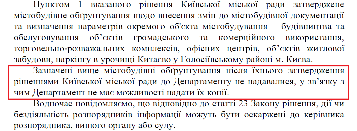 Response from the Department about the absence of urban planning justifications approved by Kyiv City Council
