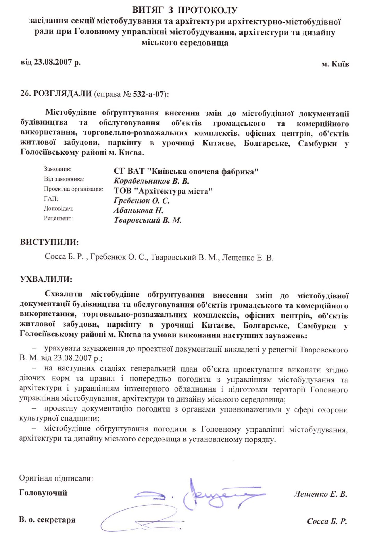 The previously mentioned session of the urban planning and architecture council on August 23, 2007, is no coincidence, as the excerpt from its protocol became the main document confirming the legality of General Plan changes by Kyiv City Council decisions. Copies of it and numerous approvals and expertise conclusions in all five land management projects refer exactly to this protocol excerpt. But what legal force does it have?