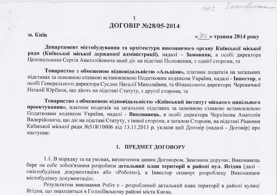 It should be noted that Tselovalnyk issued the UPC in advance as part of a typical then corrupt scheme. The very next day after issuance, a contract was signed to develop a detailed territory plan that was to legalize the violations upon UPC issuance after approval. The investor in the development was LLC “Altsion.”