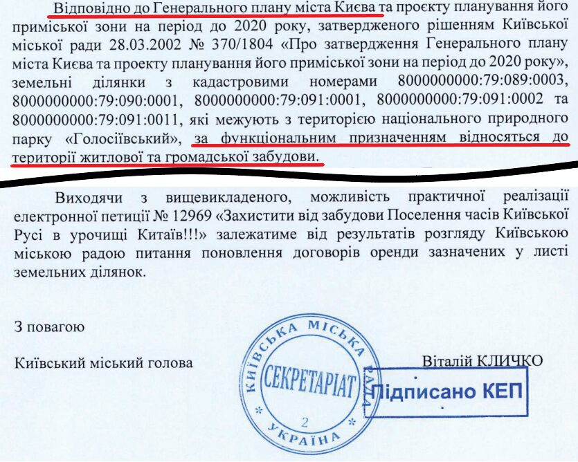 However, Mayor Vitalii Klitschko did not support the petition. In his response dated May 23, 2024, he stated that the Kyiv City Council would make the final decision during consideration of the lease renewal issues. It is important to note that Klitschko’s response included false information, claiming that according to Kyiv’s General Plan, all the plots in question fall under the “residential and public development” functional zone.