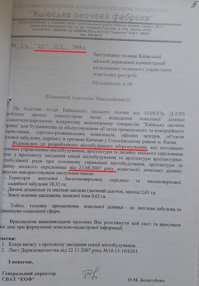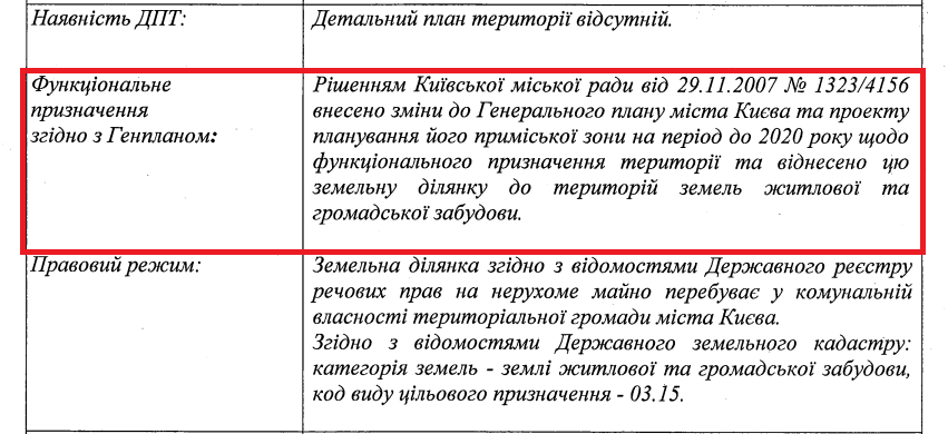 This document directly stated that the functional designation of the territory in Kyiv’s General Plan was agricultural. And that for realizing their intentions, the client needed to initiate changes in urban planning documentation.