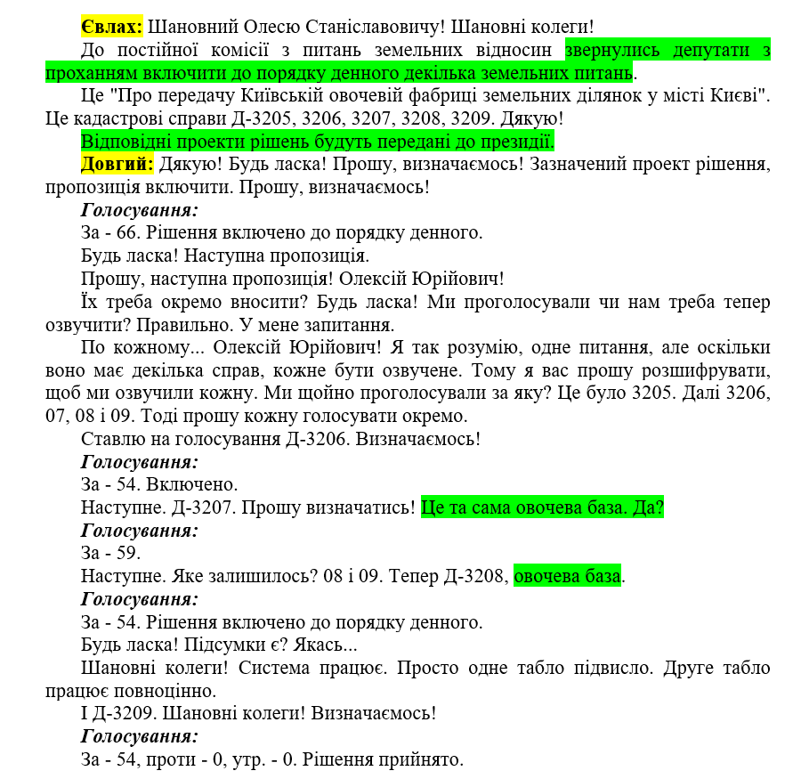 According to the transcript of the Kyiv City Council meeting on November 29, 2007, the issue was included in the agenda by voice at the proposal of the head of the land commission, Oleksiy Yevlakh. The draft decisions themselves were not even at the presidium of Kyiv City Council and no information about the content was voiced, except cadastral file numbers and the tenant’s name. Kyiv City Council Secretary Oles Dovhy called it the “vegetable base.”