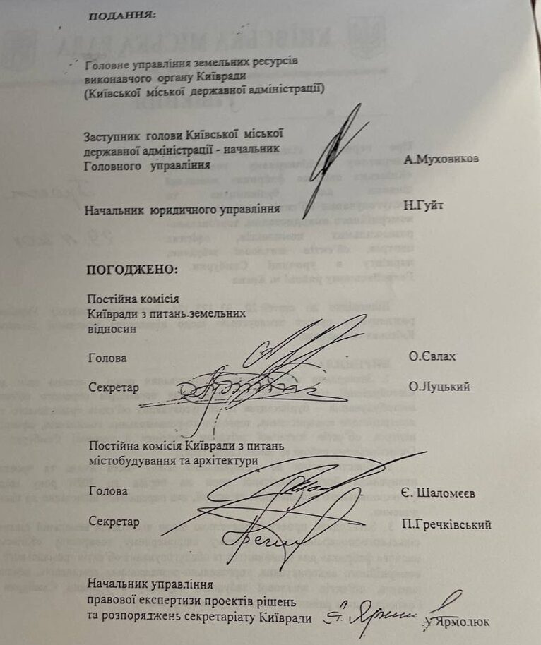 All this suggests a high probability that the drafts were prepared after Kyiv City Council’s decisions and added to the materials retroactively. It is worth recalling that land commission head Oleksiy Yevlakh was caught falsifying other Kyiv City Council decisions in the fall of 2007. In October 2011, the court found him guilty and immediately released him under amnesty.