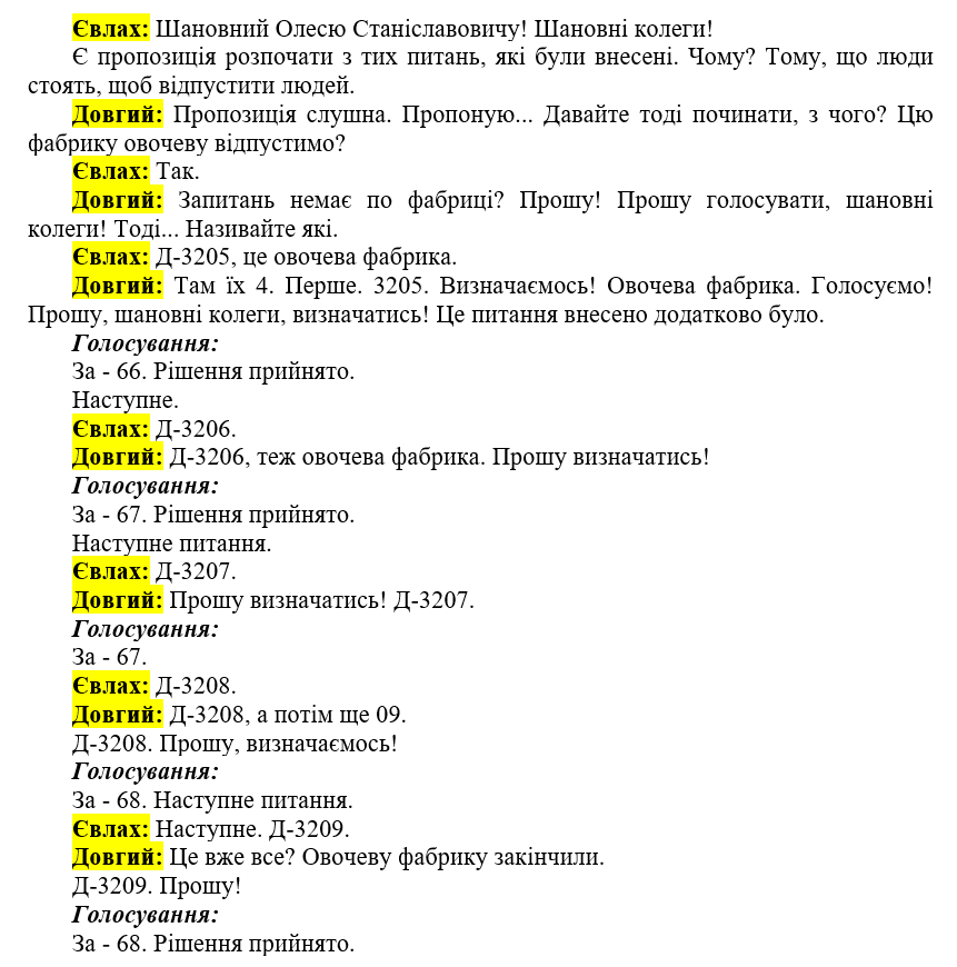 During voting on the substance of the decisions, again no information about their content was announced. Yevlakh asked to consider the matter first “to release the people” who were waiting.