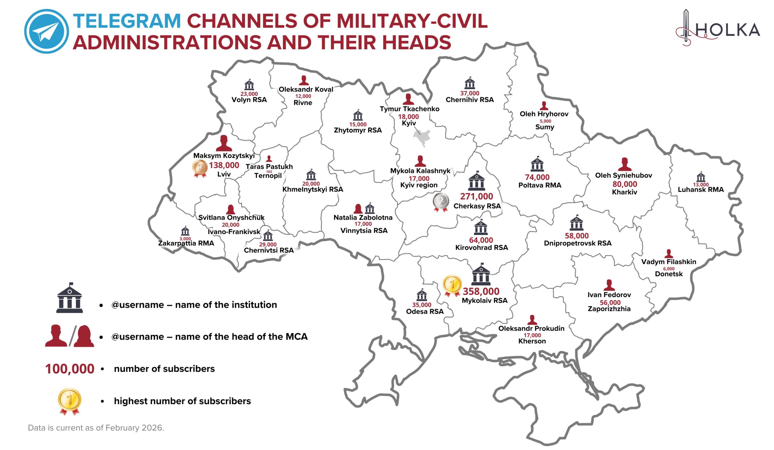 Twelve Telegram channels belonging to the heads of regional military-civil administrations (MCAs) are personalized.