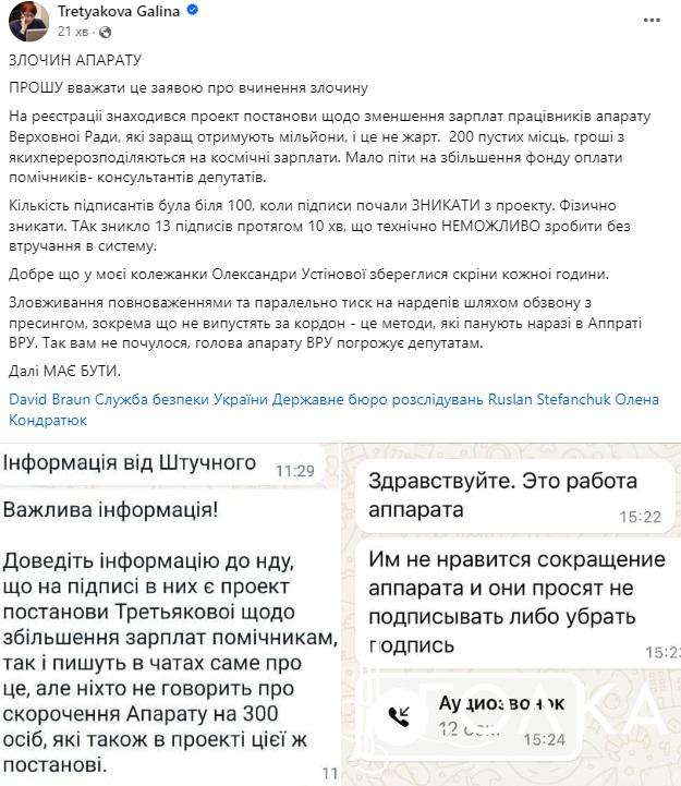 After the publication of the article on the “Holka” website, members of parliament reported that they were facing pressure from the Verkhovna Rada Apparatus. Some MPs withdrew their signatures from the initiative to introduce a draft resolution to parliament. Tretyakova provided screenshots of such messages and requested that her Facebook post be considered a statement of a crime.