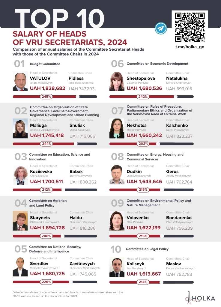 These figures come from an analysis of 2024 asset declarations of committee chairs and secretariat heads in the Verkhovna Rada, conducted by the civic initiative “Holka.”