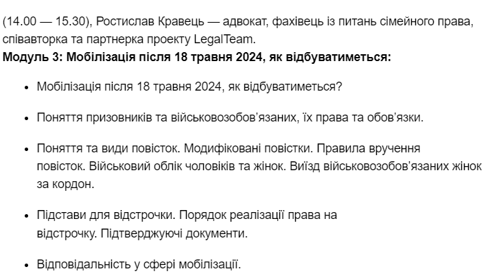 So, what do the organizers of the educational event propose that the “family law expert” Kravets cover? The same topic of mobilization, on which he has been spreading and will continue to spread his “vatnik” narratives.