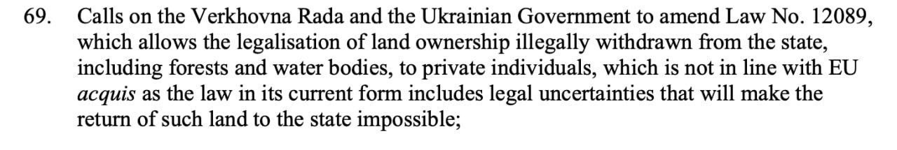 “Draft Law No. 12089 allows the legalisation of private ownership of land plots that were illegally removed from state ownership, including forests and water bodies. Such an approach does not belong to the EU legal system and, in its current wording, contains legal uncertainty that will make it impossible to return such land to state ownership.”