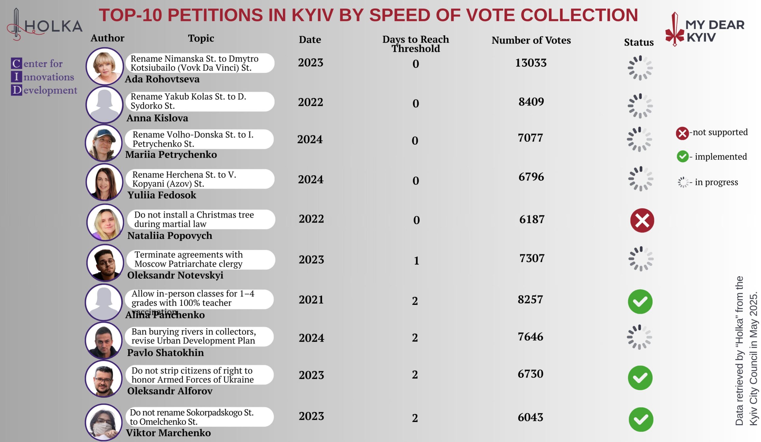 However, topping the list for fastest vote collection are petitions where Kyivans demanded renaming streets in honor of fallen heroes. For such petitions, the required vote threshold was 0 days—they closed basically instantly.