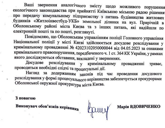 Photo: Response of the Obolon Police Department of the Main Department of the National Police in Kyiv to the MP’s appeal regarding violations of environmental legislation