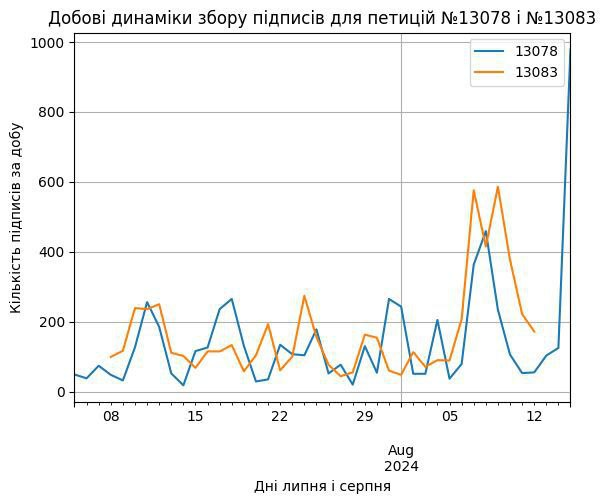 Calculation of the dynamics of the number of signatures by Vadym Kovadlo. The blue indicates a petition in favor of the parking lot construction, and the orange indicates a petition against it.