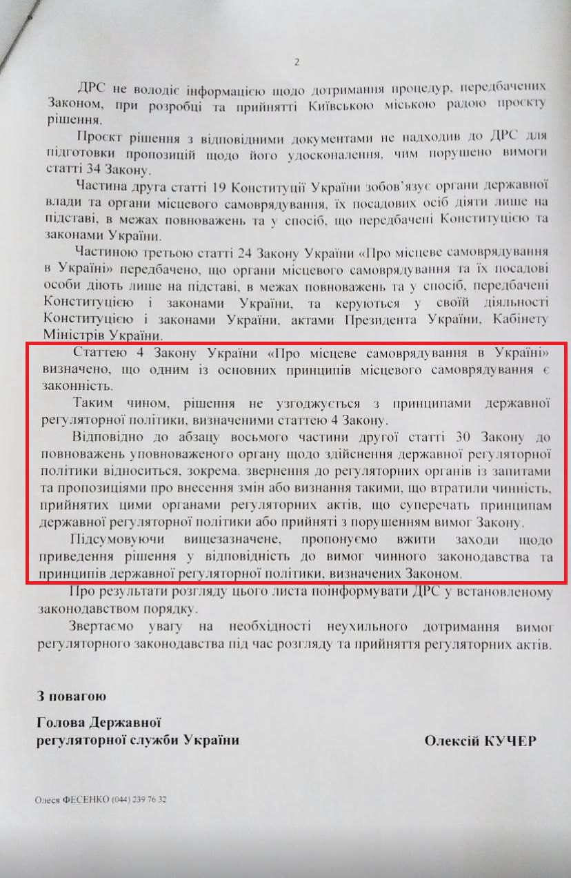 Thus, the decision is not in line with the principles of state regulatory policy… Summarizing the above, we suggest taking measures to bring the decision in line with the requirements of current legislation and the principles of state regulatory policy defined by the Law.