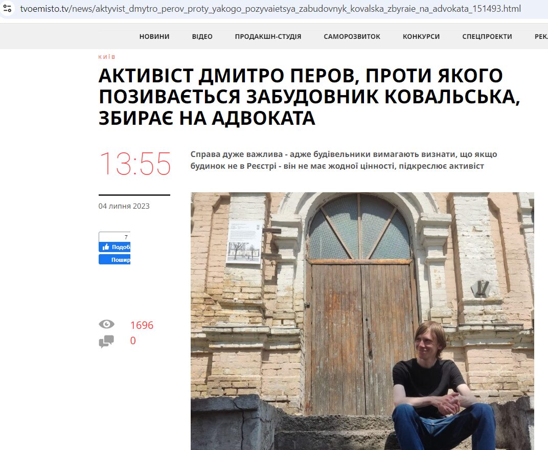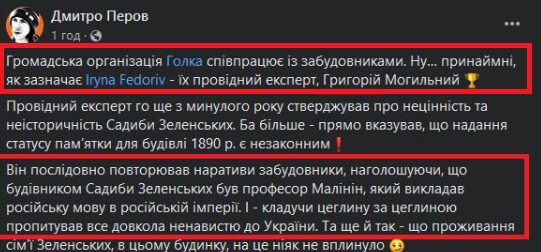 І тут треба зазначити, що “Слуга народу” — це партія влади, яка отримує гроші з бюджету. Постає цілком логічне питання: якщо у партії влади є бюджет із наших податків, у містах є депутати та їхні помічники, для голови партії “Слуга народу” дуже важлива пам’яткоохоронна робота й вона підтримує Перова, то де ж адвокати партії, які можуть надати у таких випадках правову допомогу? Чому Мінкульт, де керівника призначає монобільшість, не діяв в історії з садибою Зеленських, яку зрештою знищили? Що це за пам’яткоохоронна діяльність і де реальна підтримка з боку голови партії “Слуга народу”, яка має повноваження не лише ставити лайки й коментувати дописи?