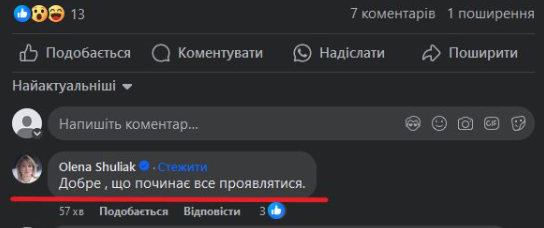 У коментарях під дописом одразу ж з’являється голова партії “Слуга народу” Олена Шуляк, яка лобіює містобудівну “реформу” у вигляді законопроєкту 5655.