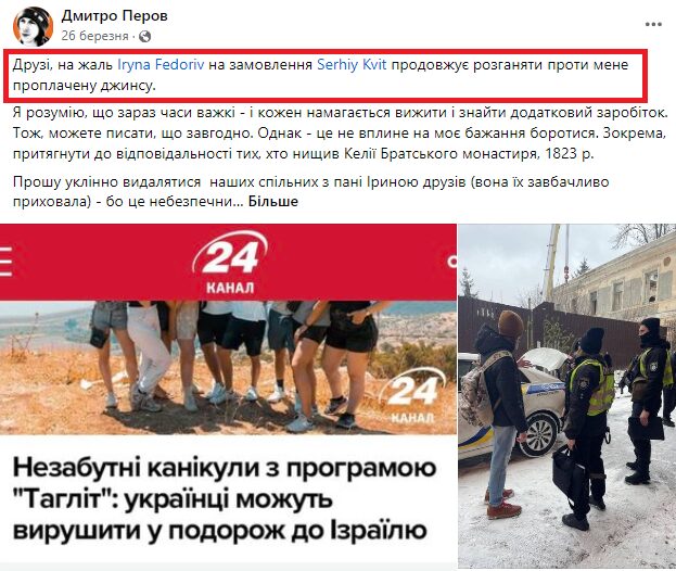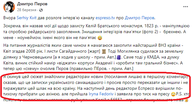 Перов не вперше поширює фейки проти тих, хто виступає проти дій голови провладної партії “Слуга народу”, яка лобіює вигідні для великих забудовників правила гри. Коли за зверненням Шуляк у Києво-Могилянській академії проводилися протиправні перевірки й про це писали медіа, помічник депутатки “Слуги народу” звинуватив президента Могилянки в тому, що на його замовлення медіа розміщували проплачену джинсу.