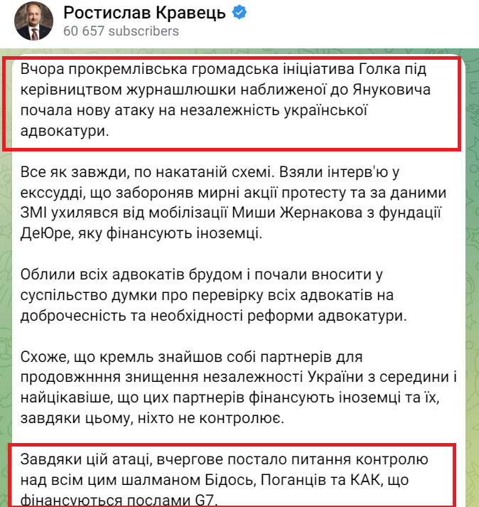 Кравець пише, що за громадською ініціативою “Голка” є слід Кремля, і в тому ж самому дописі пише про фінансування з боку послів G7. Його дуже непокоїть те, що громадська ініціатива просуває реформу адвокатури, де більше як десять років панує монополія соратників Віктора Медведчука.