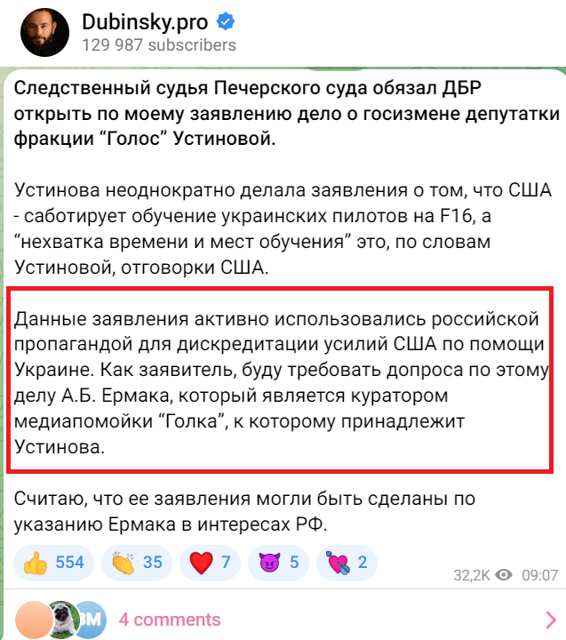 Нещодавно телеграм-канал нардепа Олександра Дубінського, якого підозрюють у державній зраді, поширив черговий фейк. Нібито за громадською ініціативою “Голка” стоїть голова Офісу президента Андрій Єрмак. Це він написав в одному дописі про те, що домігся через суд відкриття провадження проти народної депутатки Олександри Устінової (“Голос”) за статтею “державна зрада”.