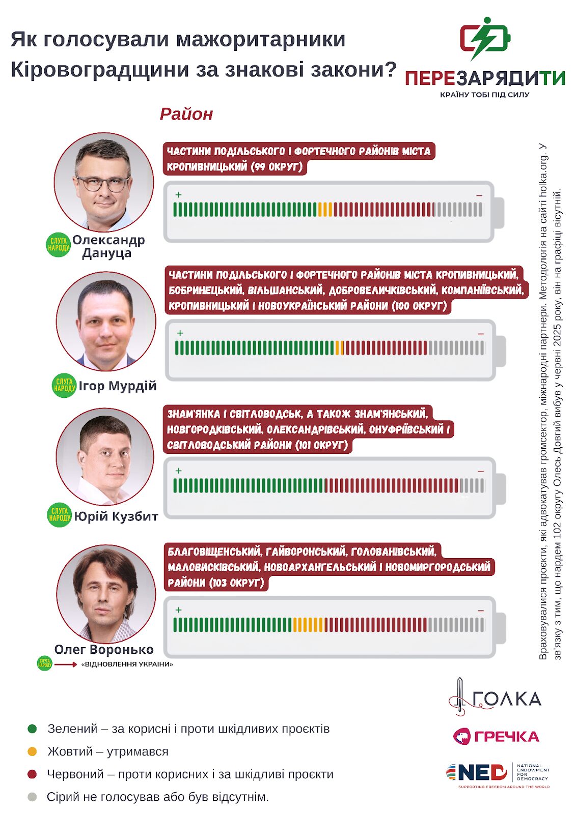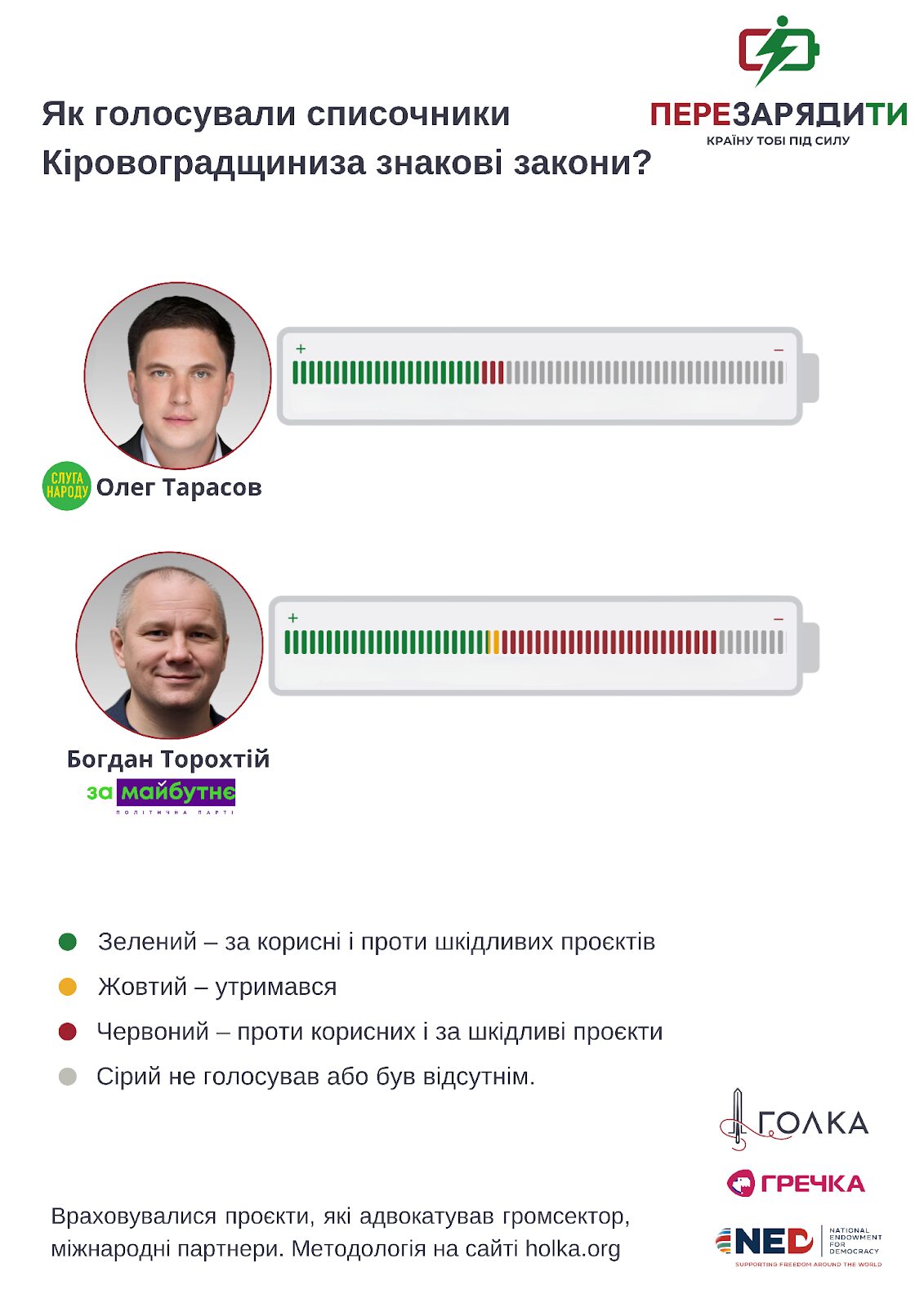 Громадська ініціатива “Голка” разом з коаліцією інших громадських організацій, зокрема з Центром розвитку інновацій та Українською природоохоронною групою, запустила волонтерський проєкт “Перезарядити країну”. Аналітики склали перелік корисних та шкідливих для розвитку країни законодавчих ініціатив, голосування за які є маркерами для кожного з депутатів. Усі ці голосування наповнюють батарейку голосувань кожного парламентаря і показують, який заряд він дає країні. Окрім голосувань, які вже відбулися, інструмент містить єдине вікно для адвокації громадського сектору, куди будуть вноситися корисні та шкідливі закони, які перебувають на розгляді парламенту. Цей проєкт створений за кошти великого українського народу і з листопада 2025 року підтримується NED.