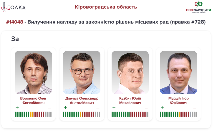 Торік Верховна Рада розглядала законопроєкт, який мав стати продовженням реформи децентралізації і запровадити систему нагляду за законністю діяльності місцевих рад (проєкт №14048). Але у другому читанні депутати підтримали правку №728, яка вихолощувала систему нагляду і виводила з-під неї більшість рішень місцевих рад, а це зокрема, земельні, бюджетні, кадрові питання тощо. Таким чином, у громадян та у держави і далі відсутній механізм, який дозволив би реагувати на відверті і очевидні порушення законодавства, як “туалетні схеми”, сумнівні детальні плани територій та інші. Усі мажоритарники Кіровоградщини підтримали цю шкідливу правку.