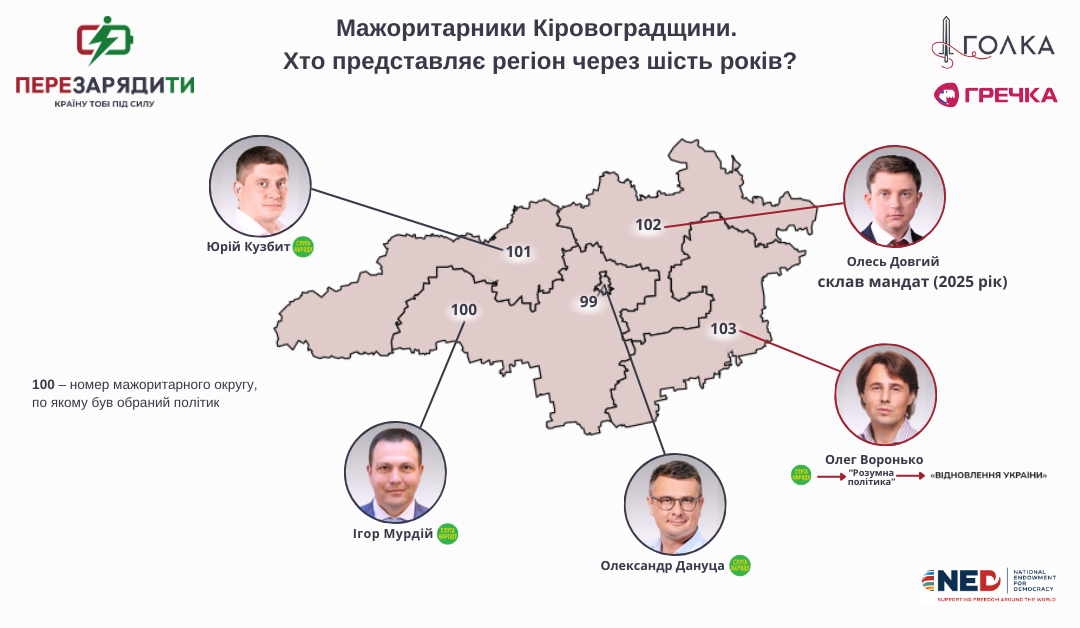 Кіровоградщину у Верховній Раді представляють троє народних депутатів мажоритарників із фракції “Слуга народу” – Олександр Дануца, Ігор Мурдій, Юрій Кузбит та один представник “Відновлення України” Олег Воронько.