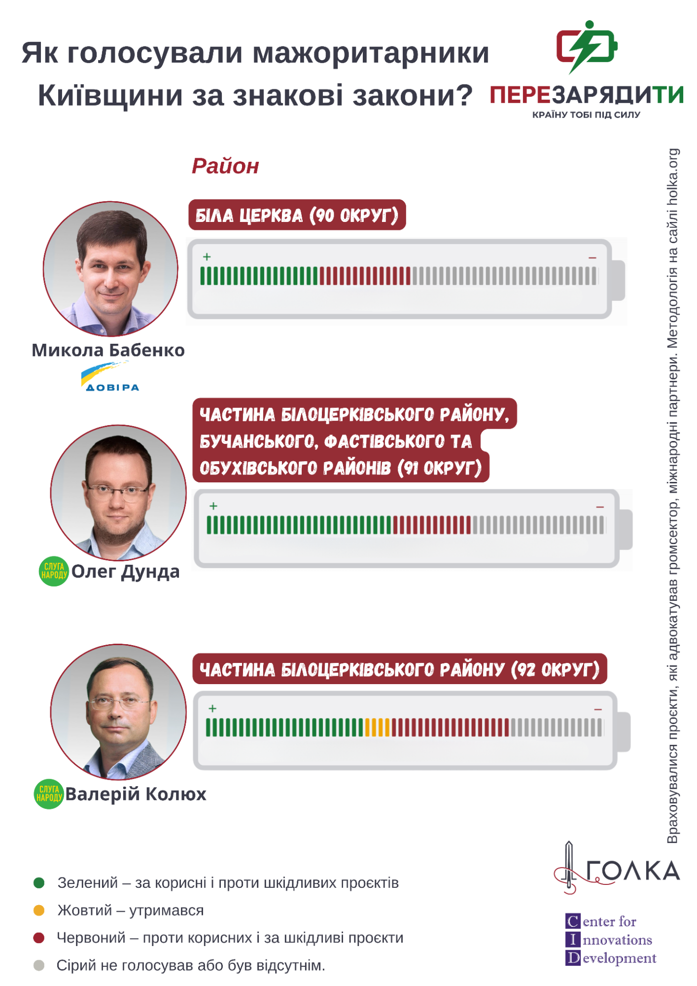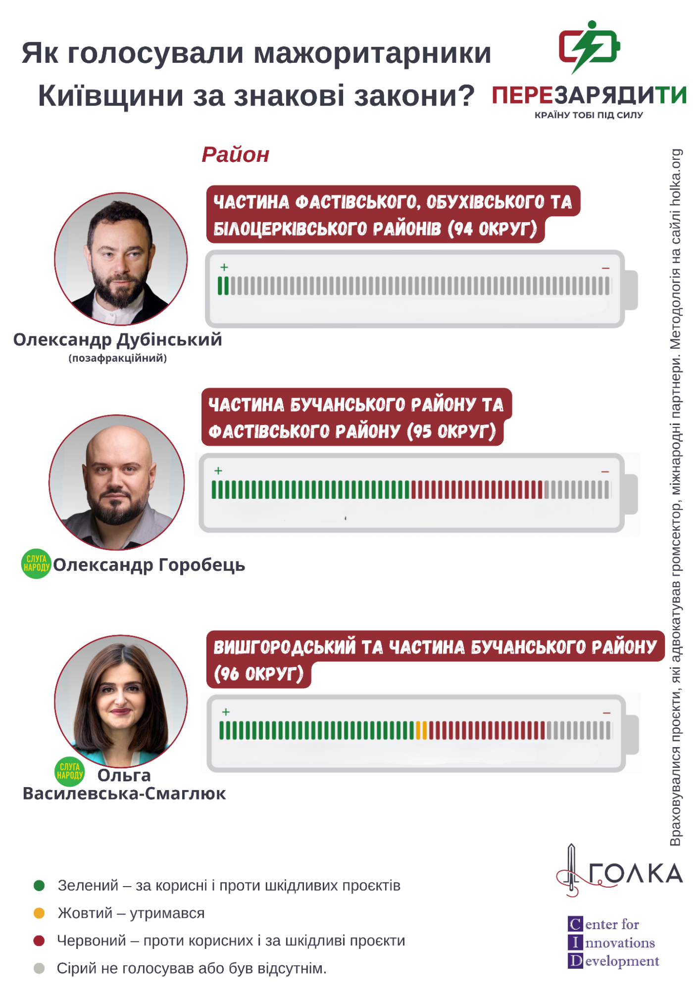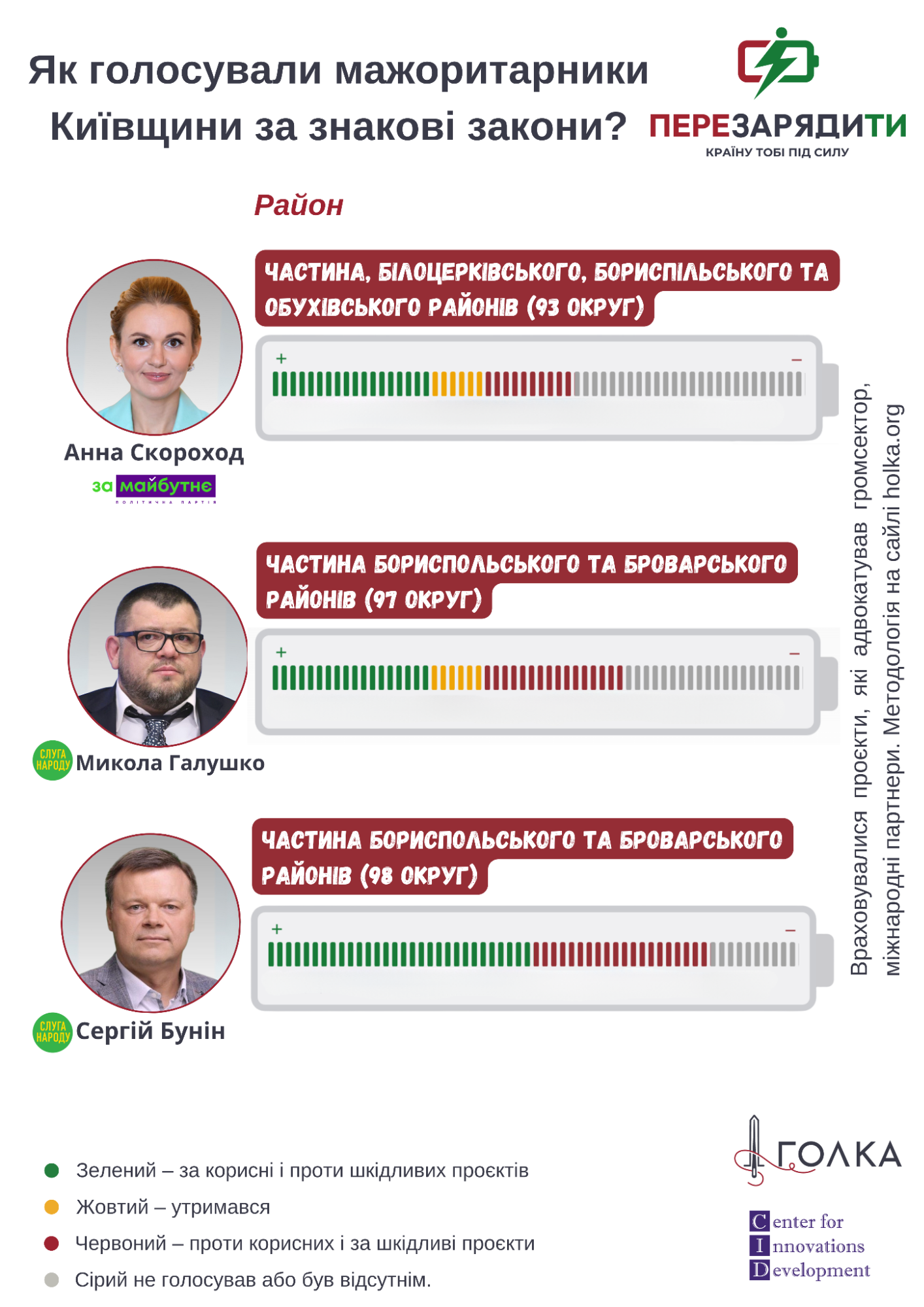 За всі шість років роботи парламенту з-поміж питань, які несли найбільші корупційні ризики, стало нещодавнє рішення парламенту скасувати незалежність антикорупційних органів НАБУ і САП. Через це у війну з ризиком для власної безпеки тисячі громадян вийшли на протести з картонками. На відміну від мажоритарників столиці, з-поміж нардепів Київщини не було жодного народного депутата, хто б проголосував проти цього питання. Так, Олександр Горобець, Олег Дунда, Микола Галушко, Сергій Бунін, Валерій Колюх, Микола Галушко, Микола Бабенко віддали свої голоси “за”. Народна депутатка Ольга Василевська-Смаглюк за це питання не голосувала, хоча підтримала пропозицію Максима Бужанського невідкладно підписати цей закон. А Скороход – була відсутня.