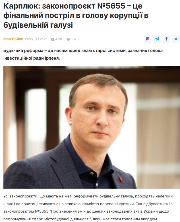 Але те, що обурювало українців чи міжнародних партнерів, видавалося прийнятним для забудовників. Ексмер Ірпеня Володимир Карплюк, який є фігурантом низки антикорупційних розслідувань саме через скандальні забудови в регіоні, назвав цей законопроєкт “фінальним пострілом в голову корупції”.