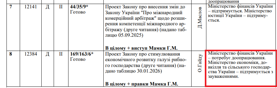Зауваження є навіть у профільних міністерств. Так Міністерство фінансів вимагає доопрацювати законопроєкт, а Мінекономіки, довкілля і сільського господарства має свої зауваження.