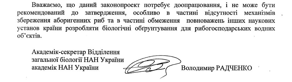 Уривок з листа Академіка-секретаря відділення загальної біології Національної академії наук України щодо законопроєкту 12384