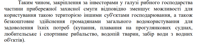 “Розміщення виробничої інфраструктури, зокрема причалів, сортувальних майданчиків чи рибоприймальних пунктів, потенційно впливає на стан водних об’єктів та прибережних екосистем, тоді як у законопроєкті не передбачено окремих механізмів попереднього екологічного аналізу або інших запобіжників для мінімізації такого впливу. Крім того, навіть за умови незначної площі окремих земельних ділянок їх сукупне розміщення вздовж берегової лінії може призвести до поступового обмеження доступу до водних об’єктів та змін у використанні прибережних територій, що потребує додаткових гарантій дотримання природоохоронного законодавства і забезпечення вільного доступу громадян до водних об’єктів”.